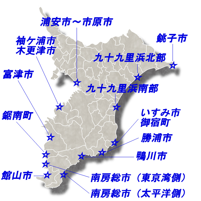 房総半島の南端に位置する南房総市。沿岸部の水深が浅い房総半島においては、比較的水深のある地磯が多いエリアで、大アジ・クロダイ・メジナ・イシダイ・ヒラスズキなどを釣ることができる。また東側には広大な砂浜が広がっており、キス・イシモチ・マゴチ・ヒラメなどが釣れるが、サーフィンの人気エリアでもあるため竿を出す時間やポイントを考慮する必要がある。ファミリーフィッシングでは足場の良い岸壁から釣りができる乙浜港が人気の釣り場だ。