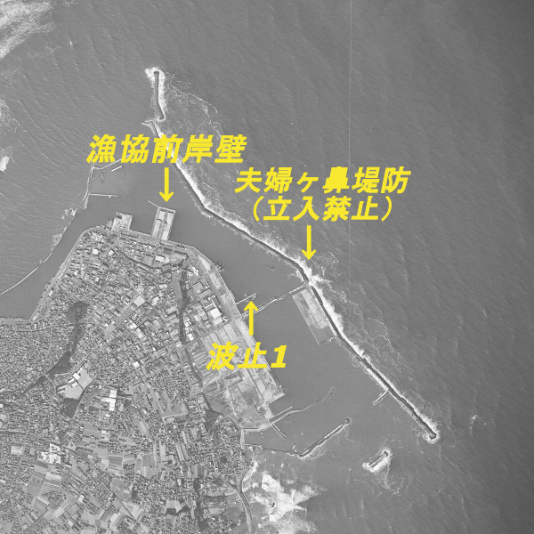 日本一の水揚げを誇る巨大な銚子漁港。その外側にある港が銚子外港と呼ばれている。銚子外港全体は夫婦ヶ鼻堤防と呼ばれる巨大な堤防に囲まれており、夫婦ヶ鼻堤防は立入禁止になっているため、夫婦ヶ鼻堤防の手前の波止(上記空中写真「波止1」)や、漁協前の岸壁などが釣り場になっている。釣りものはアジ・イシモチ・ヒラメ・クロダイ・スズキなど。