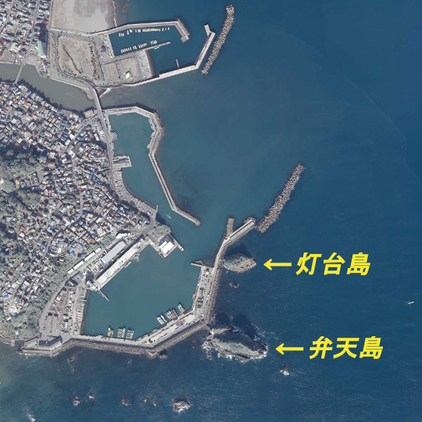 南波止の外側にある「弁天島」と「灯台島」は、南波止と橋で繋がり渡ることができる。その地磯は足元から水深があり、沖磯にも負けない好地磯で、アジ・サヨリ・イナダ・クロダイ・メジナ・イシダイ・ヒラスズキなどが釣れる。港内はアジやカマスなどが釣れるが、漁具なども置かれているため釣り座は広くない。