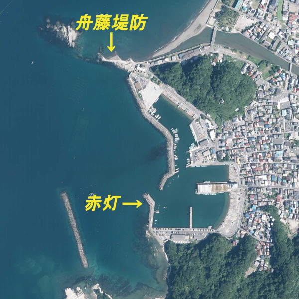 以前は赤灯波止で釣りができたようだが、現在ではフェンスが設置され立入禁止になっている。勝山港のすぐ北側にある舟藤堤防では釣りが可能で、クロダイ・メジナ・アオリイカなどが釣れる人気の釣り場だ。