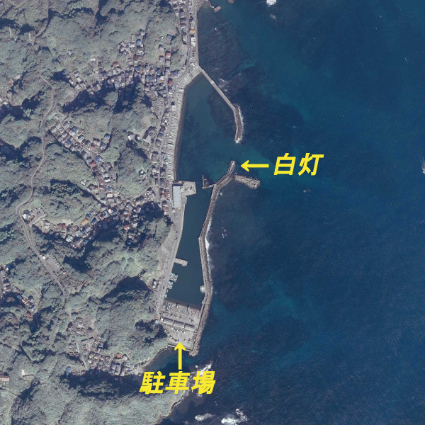 白灯波止の先端が人気の釣り座で、アジ・サヨリ・クロダイ・メジナ・ヒラメなどが釣れる。駐車場裏側(東側)のテトラから竿を出す人もいるが、足場が悪いので安全には十分に気をつけて欲しい。